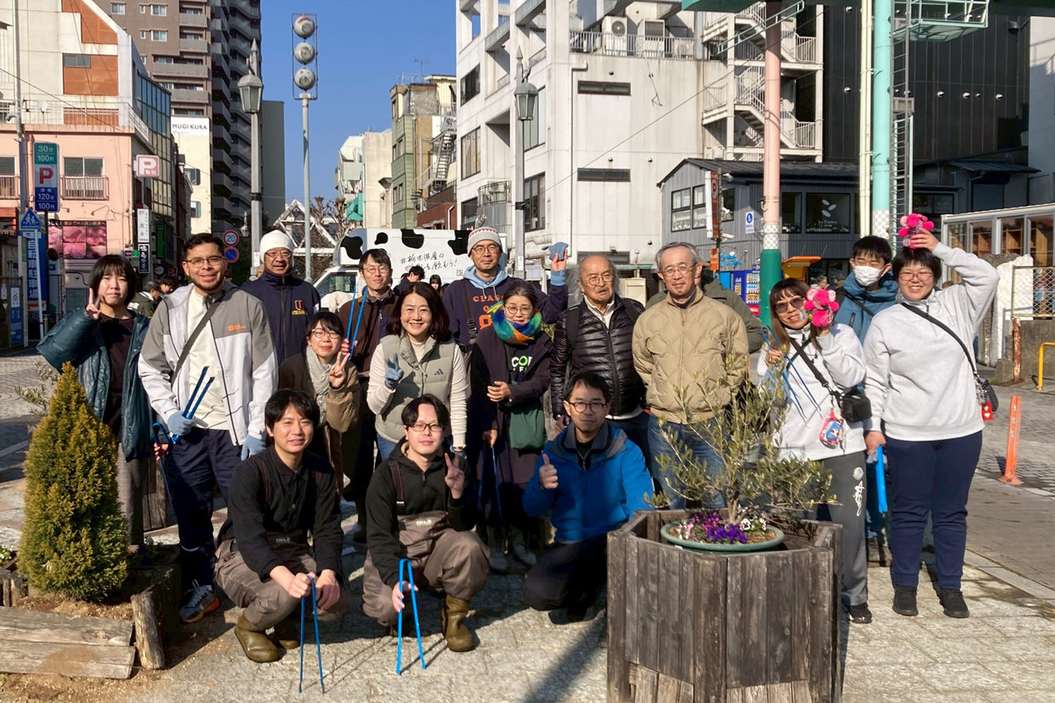 「釜川朝活!」として、他団体と連携しながら、定期的に道路や河川内のゴミを清掃しています。河川をめぐる環境問題を再考し、地域への愛着を育むとともに、清掃を通じて生まれる、地域や釜川に興味のある方々とのつながり、関わりあいも大切にしています。